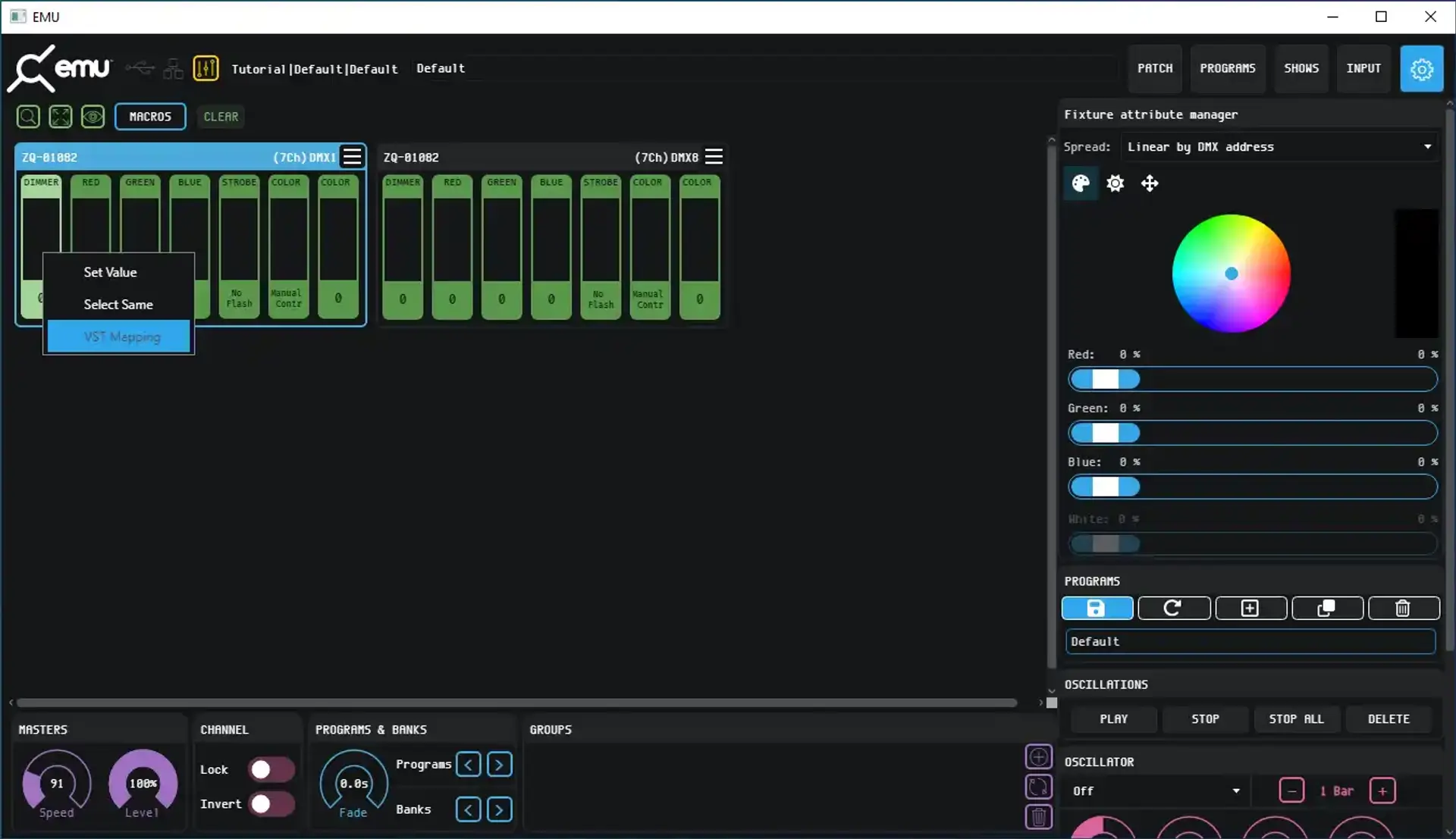 Now you can hop back over to EMU and start mapping channels. To do this, right click on a DMX channel and click "VST Mapping." This will open a dialog allowing you to select a VST track.