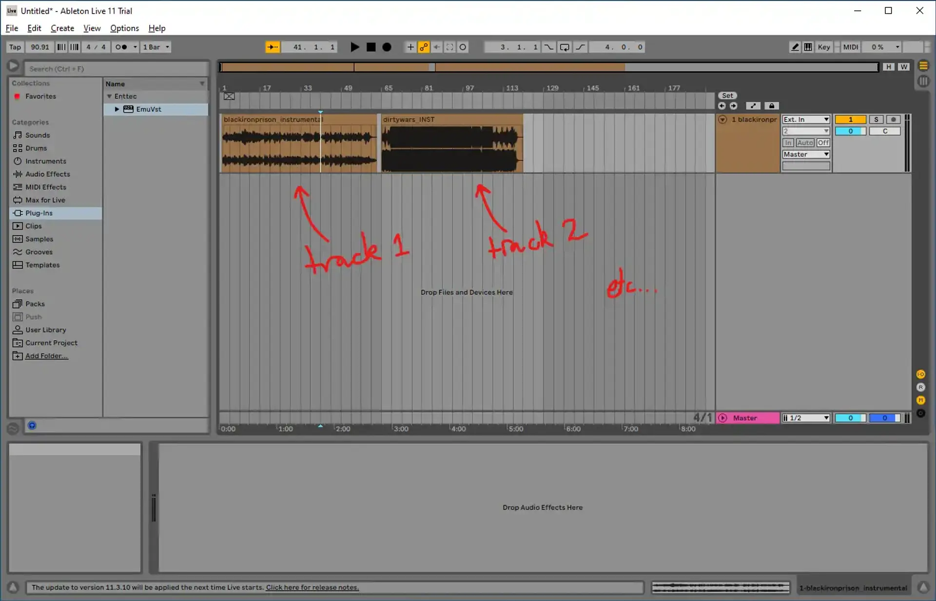 Begin by deleting all the default Ableton tracks except for one audio track and the master track. Then, switch over to the arrangement view and import your setlist into the audio track. I left a small gap between each track, so that I could easily play/pause the audio during the performance.