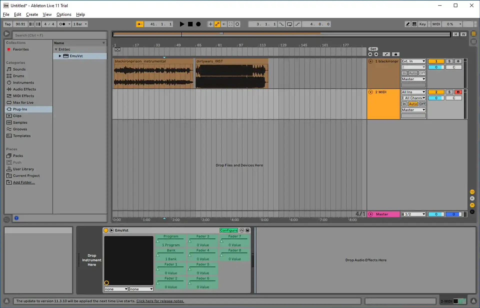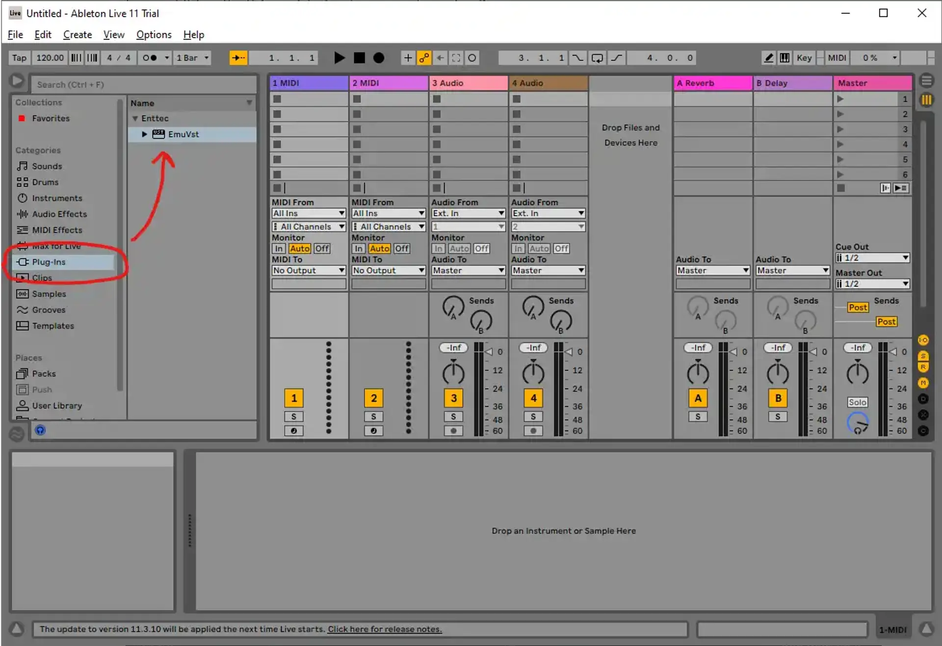 To control DMX through Ableton, we need to use a plugin called EmuVST. Install Ableton FIRST, and then install EMU. This will ensure that the EmuVST plugin gets installed correctly. You can find the plugin by selecting "Plug-Ins" and then expanding the Enttec tab that opens.