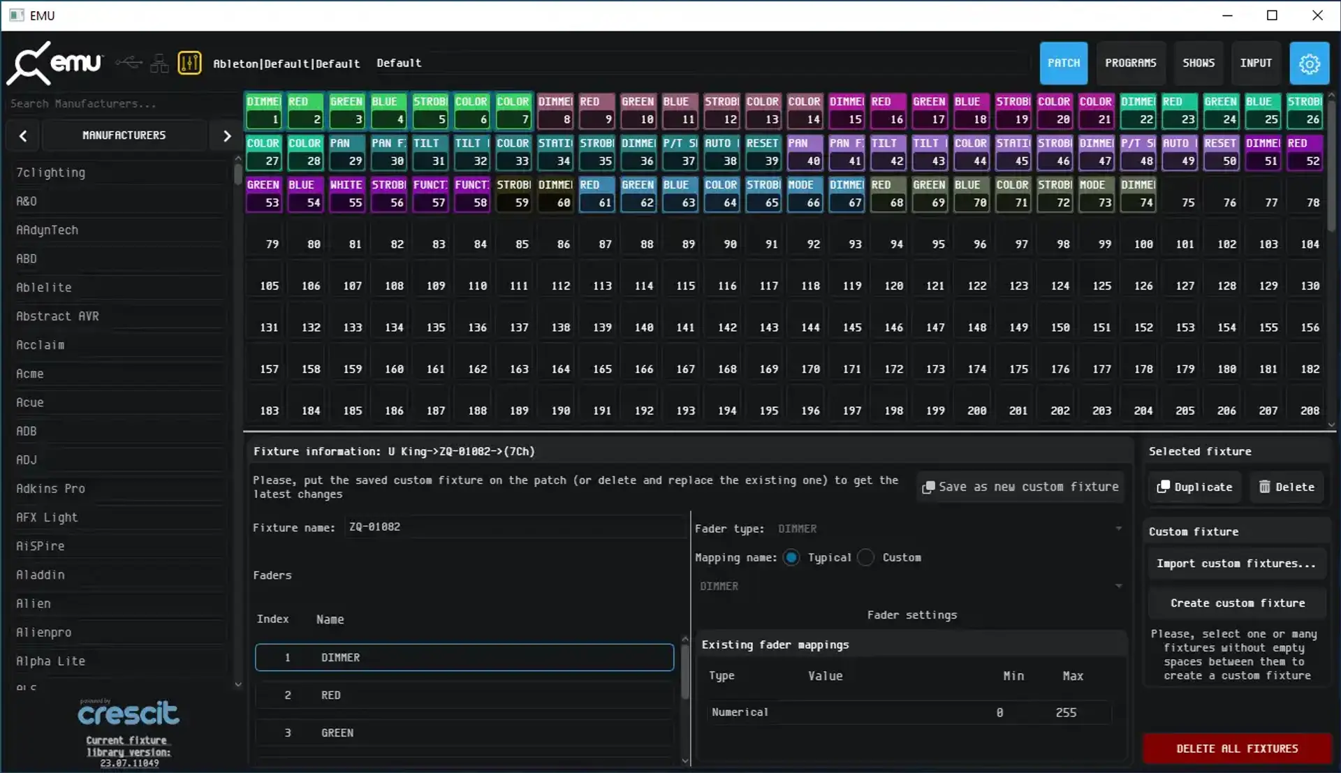 Start by patching your DMX setup into EMU. Many DMX lights have different modes, which control how many channels are used by the lights. In hindsight, I would suggest using the simpler modes since we will have to manually keyframe each channel later on.