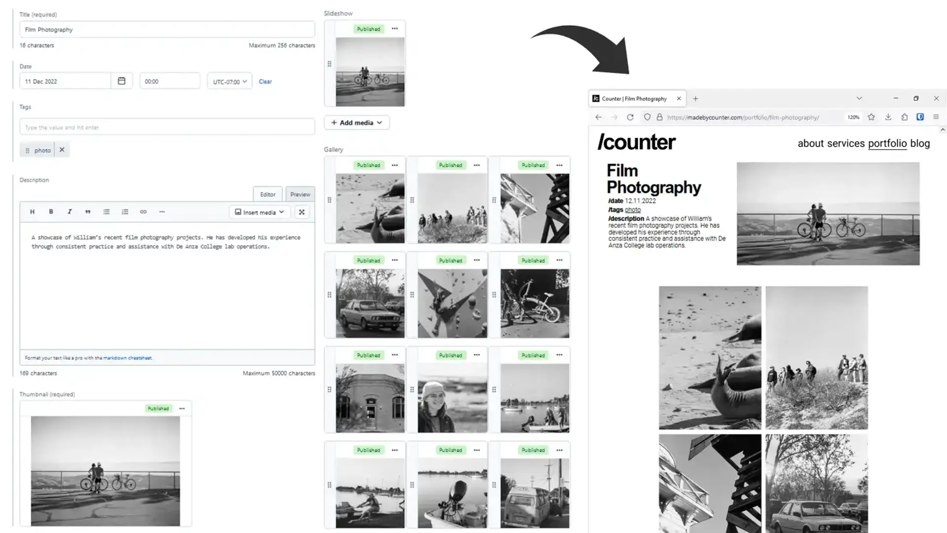 In addition, we wanted to be able to "dump" a large range of media assets into each portfolio item and for them to display properly without any extra work. To achieve this required some creative rethinking of already existing tools.